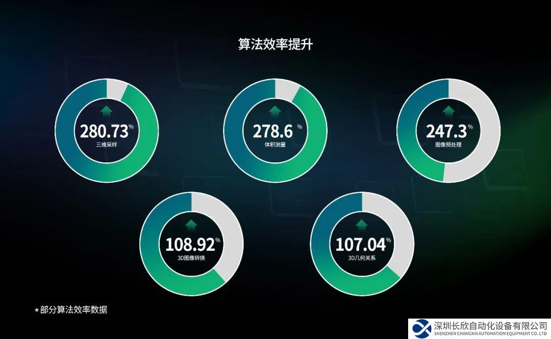 特別是一些高速飛拍和高分辨率的檢測(cè)場(chǎng)景,Smart3視覺軟件算法運(yùn)行效率優(yōu)勢(shì)更明顯。以三維采樣和體積測(cè)量算法為例,兩者效率提升均超過270%,對(duì)比度、伽馬校正等預(yù)處理算法效率提升近250%,算法流程耗時(shí)更短。