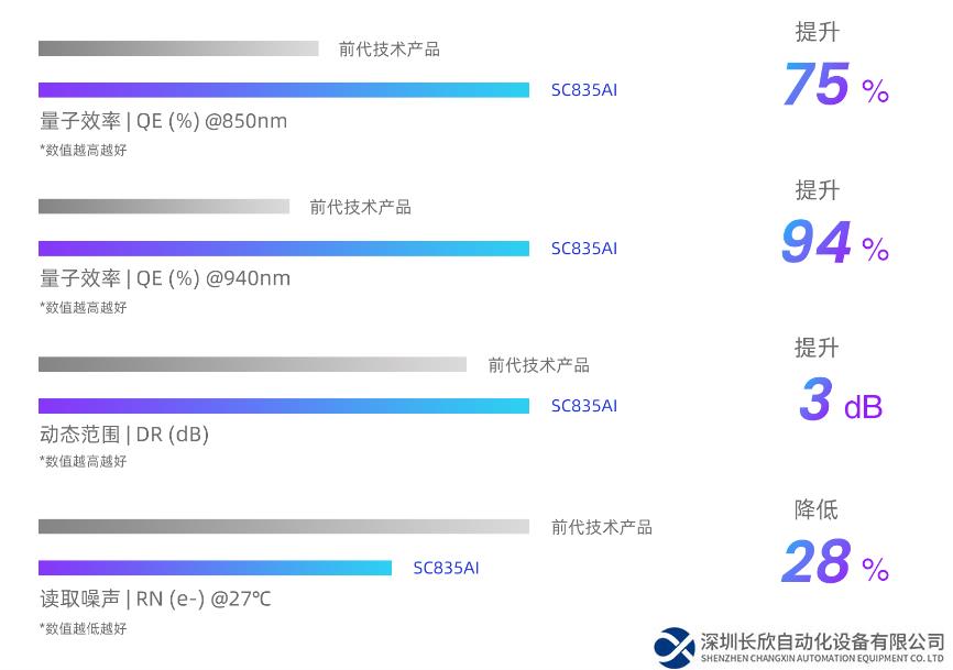 三款新品采用思特威先進(jìn)的SmartClarity?-3技術(shù),通過思特威SFCPixel?專利技術(shù)和BSI像素工藝,實(shí)現(xiàn)感度和量子效率的有效提升,進(jìn)而呈現(xiàn)清晰的暗光或夜視成像效果。相較前代技術(shù)產(chǎn)品,SC235AI和SC435AI在520nm可見光波段下的量子效率(QE)分別提升了22%和28%。同時(shí),思特威Lightbox IR?技術(shù)為圖像傳感器帶來近紅外感度的顯著提升,通過光學(xué)調(diào)制(OM)和深槽隔離(DTI)等工藝,使像素感光區(qū)域?qū)t外光的吸收能力增強(qiáng),進(jìn)一步提高量子效率并減少像素串?dāng)_(crosstalk)。與前代技術(shù)產(chǎn)品相比,SC835AI在850nm波段和940nm波段的量子效率(QE)分別提升了約75%和94%,可在超低照度環(huán)境中捕獲更加清晰真實(shí)的影像。