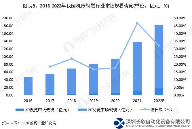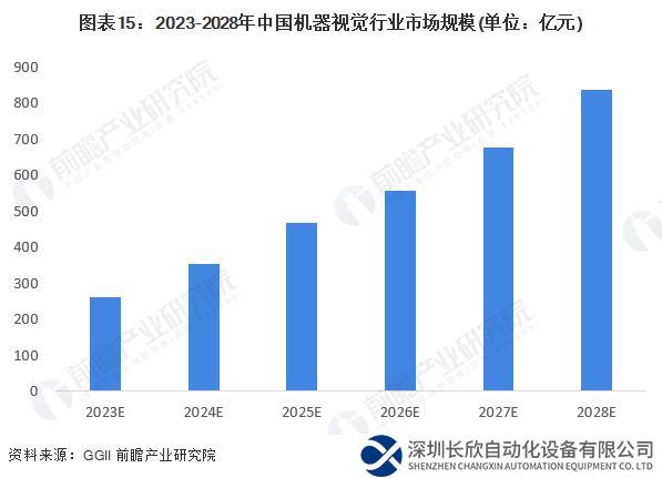 中國的機器視覺行業(yè)是伴隨中國工業(yè)化進程的發(fā)展而崛起的,中國正在成為世界機器視覺發(fā)展最活躍的地區(qū)之一,應(yīng)用范圍幾乎涵蓋了國民經(jīng)濟中的各個領(lǐng)域。2021 年受物流倉儲、新能源行業(yè)的等下游需求增長影響,視覺檢測產(chǎn)品需求增長明顯。根據(jù)高工機器人產(chǎn)業(yè)研究所數(shù)據(jù),2021 年中國機器視覺市場規(guī)模達到 138.16 億元,同比增長其中 2D 視覺市場規(guī)模 126.65 億元,3D 視覺市場約為 11.51 億元。根據(jù) GGII 預(yù)測,到 2025 年我國機器視覺市場規(guī)模將達到 469 億元,2021-2025 年復(fù)合增速達到 36%。前瞻結(jié)合中國機器視覺行業(yè)市場規(guī)模的增長情況和高工機器人產(chǎn)業(yè)研究所的預(yù)測,預(yù)計 2026-2028 年中國機器視覺行業(yè)將繼續(xù)保持高速增長,其中,隨著 2D 視覺逐漸向 3D 視覺升級,保守預(yù)測 3D 視覺市場以 50% 的增速增長,2D 視覺市場以 10% 的增速增長。至 2028 年,中國機器視覺行業(yè)市場規(guī)模將達到 837 億元。