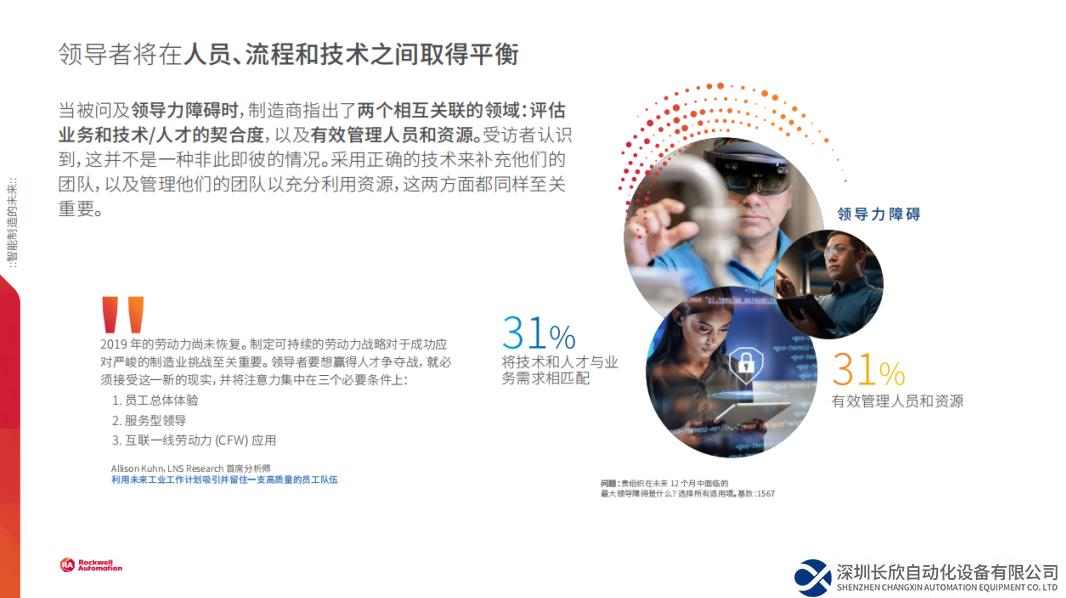 制造商仍將面臨一個重大挑戰(zhàn):如何將人員、流程和技術結合起來,推動業(yè)務的長期增長和彈性。報告顯示,約三分之一的制造業(yè)領導者認為,“使技術和人才與業(yè)務需求相匹配”以及“有效管理人員和資源 ”是企業(yè)在未來一年面臨的主要挑戰(zhàn)。制造商可以通過選擇具有相關行業(yè)專業(yè)知識和經驗的合作伙伴來克服這一挑戰(zhàn),通過合作伙伴提供量身定制的解決方案和支持,使技術和人才與業(yè)務目標保持一致。