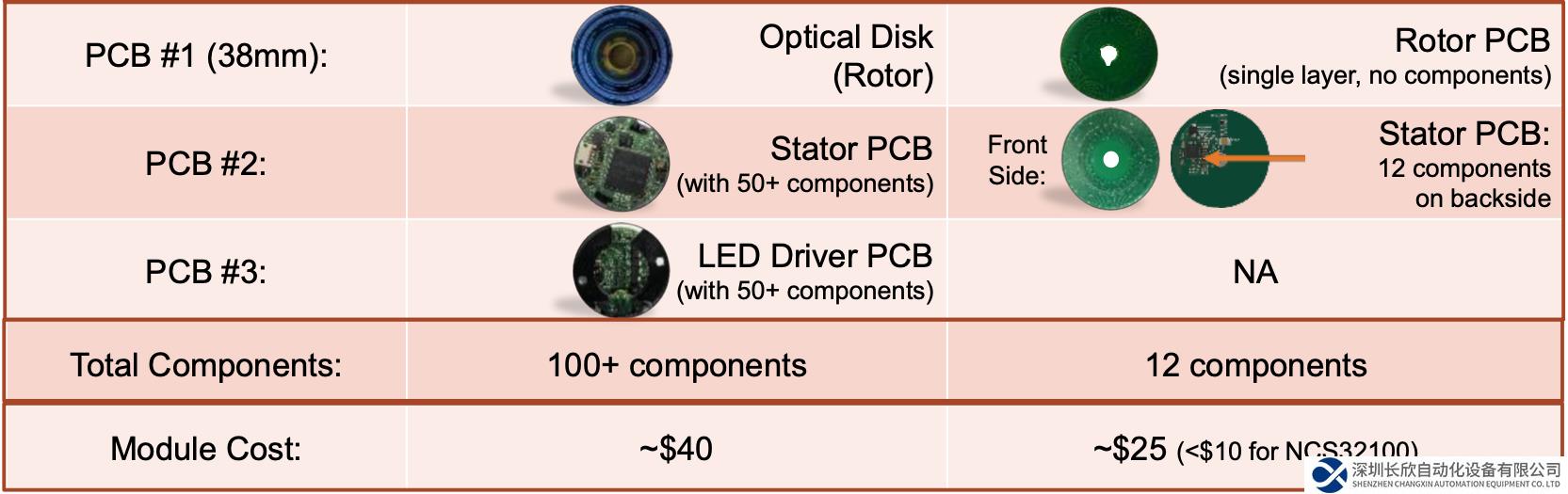 典型光學(xué)方案總共需要三塊 PCB——光學(xué)圓盤、定子 PCB 和 LED 驅(qū)動(dòng)器 PCB,實(shí)現(xiàn)全部功能需要大約 100 個(gè)器件。