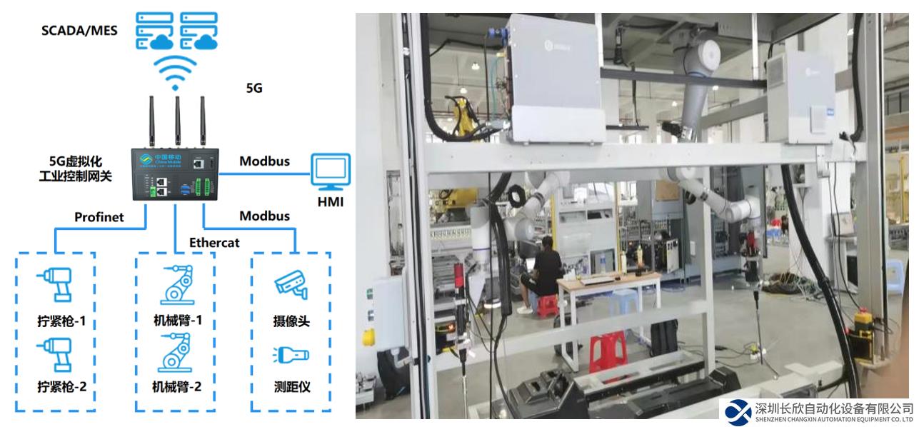 中國(guó)移動(dòng)與國(guó)內(nèi)某新能源廠商合作,在電池組裝產(chǎn)線完成5G+虛擬化PLC技術(shù)驗(yàn)證應(yīng)用。核心方案是采用一臺(tái)安裝虛擬化PLC的5G工業(yè)控制網(wǎng)關(guān),實(shí)現(xiàn)對(duì)“傳統(tǒng)PLC+數(shù)采網(wǎng)關(guān)”的二合一替換。5G工業(yè)控制網(wǎng)關(guān)首先通過掃描槍、測(cè)距儀完成位置標(biāo)定,控制機(jī)械臂移動(dòng)到電池模組位置。隨后控制機(jī)械臂上的擰緊槍完成電池模組的安裝擰緊。在此案例中,5G工業(yè)控制網(wǎng)關(guān)不僅提供PLC實(shí)時(shí)控制服務(wù),也提供5G數(shù)據(jù)采集、遠(yuǎn)程運(yùn)維服務(wù)。從而將傳統(tǒng)的“現(xiàn)場(chǎng)I/O-PLC-數(shù)采網(wǎng)關(guān)”三層架構(gòu)壓縮成“現(xiàn)場(chǎng)I/O-5G工業(yè)控制網(wǎng)關(guān)”扁平架構(gòu),解決了傳統(tǒng)方案控制層級(jí)多、專用設(shè)備多,成本居高不下,難以實(shí)現(xiàn)無人化/少人化運(yùn)維等痛點(diǎn)問題,設(shè)備硬件成本和運(yùn)維成本均下降50%。