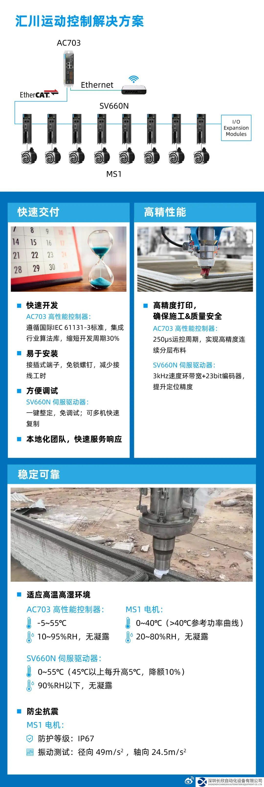 在這臺(tái)“鋼鐵巨獸”不眠不休勞作的背后,是匯川運(yùn)動(dòng)控制解決方案的運(yùn)籌帷幄,憑借快速交付、高精性能、穩(wěn)定可靠的特點(diǎn),匯川運(yùn)動(dòng)控制解決方案確保了WEAVER順利完成建設(shè)項(xiàng)目,也為3D建筑打印的規(guī)?;l(fā)展提供了案例參考。
