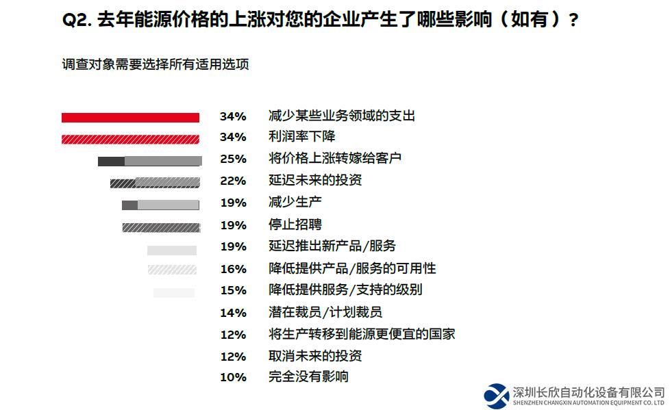 持續(xù)上升的能源成本和能源安全問題正迫使企業(yè)領(lǐng)導(dǎo)者們重新思考他們的經(jīng)營(yíng)方式和投資方向。調(diào)查顯示2022年,34%的企業(yè)受能源成本上升的影響主要體現(xiàn)在利潤(rùn)率的下降,以及34%的企業(yè)對(duì)某些業(yè)務(wù)領(lǐng)域的支出減少,這也導(dǎo)致企業(yè)減少對(duì)研發(fā)及其他業(yè)務(wù)增長(zhǎng)計(jì)劃的投入。其中,超過三分之一(38%)的企業(yè)削減了對(duì)技術(shù)的投資,33%的企業(yè)減少了基礎(chǔ)設(shè)施的支出,31%的企業(yè)削減了在市場(chǎng)營(yíng)銷方面的支出。