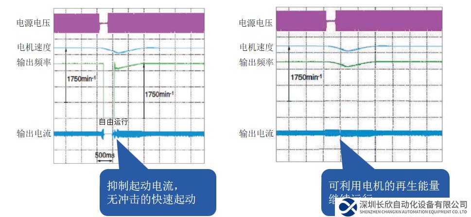 在自由運(yùn)行狀態(tài)的電機(jī)也能輕松無振動啟動。即使反轉(zhuǎn)中的電機(jī), 也可正常啟動。
