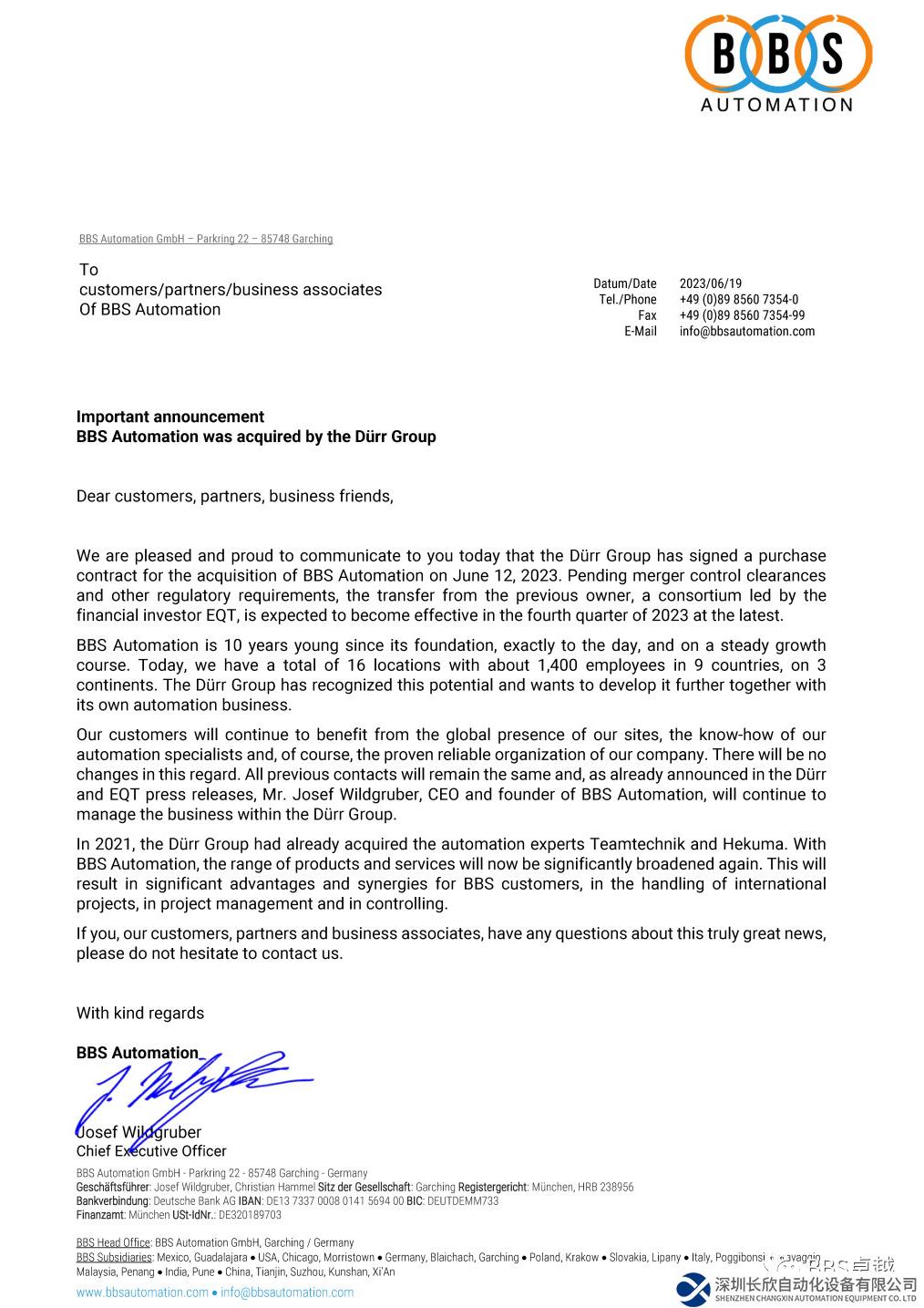 盡管杜爾集團收購了BBS卓越,BBS卓越的內部組織架構不會改變,Josef Wildgruber先生依然是BBS卓越的首席執(zhí)行官。所有業(yè)務合作關系不會更改,客戶將持續(xù)享有BBS卓越全球資源、技術團隊的專業(yè)知識和優(yōu)良的服務。