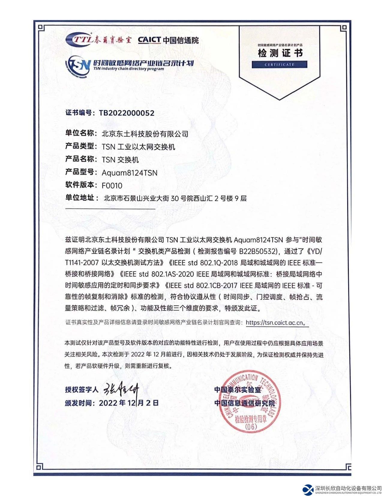 Aquam8124TSN交換機(jī)現(xiàn)已通過工業(yè)互聯(lián)網(wǎng)產(chǎn)業(yè)聯(lián)盟(AII)“時(shí)間敏感網(wǎng)絡(luò)(TSN)產(chǎn)業(yè)鏈名錄計(jì)劃”控制器類測(cè)試認(rèn)證,并在2023工業(yè)互聯(lián)網(wǎng)大會(huì)獲頒認(rèn)證證書。
