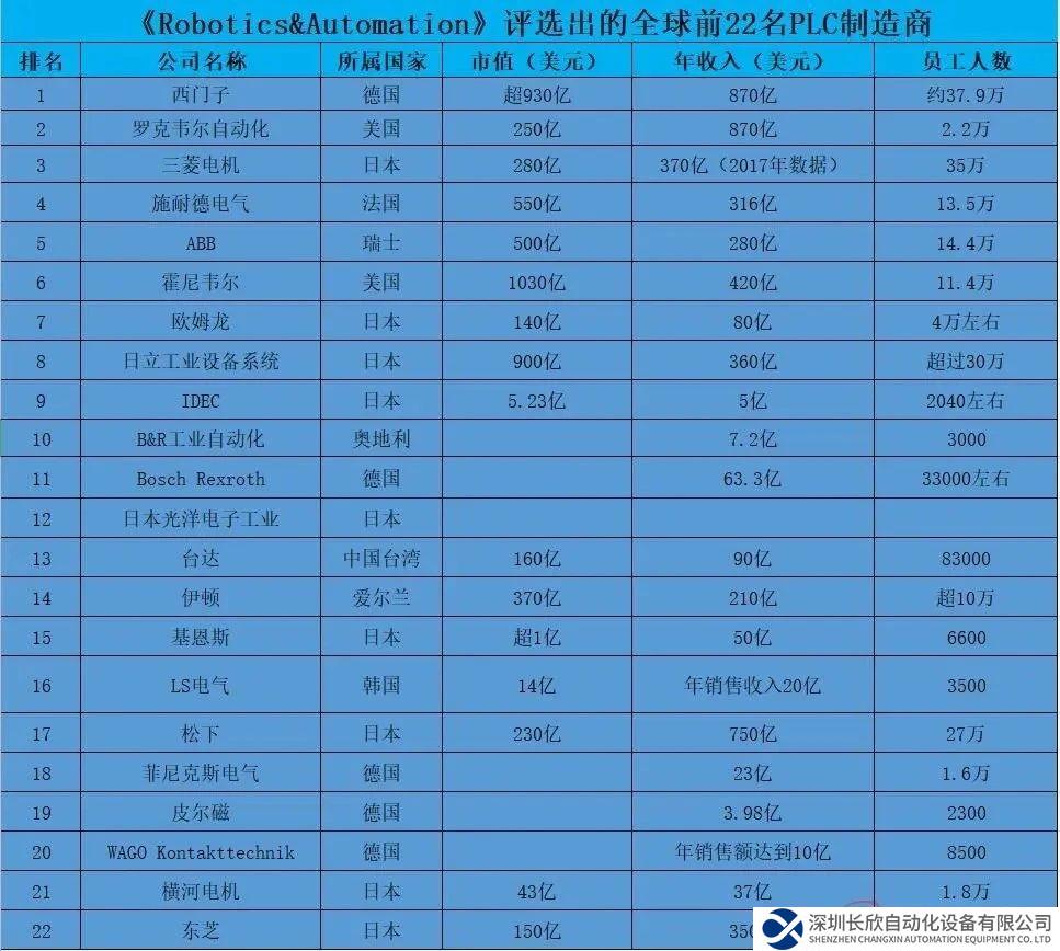 在2020年外媒《Robotics&Automation》評選出的前22名可編程邏輯控制器制造商榜單中,西門子、霍尼韋爾、施耐德、ABB、三菱電機等眾多工控巨頭企業(yè)赫然在列,仍然是歐美日占主導地位,其中日本公司有9家,德國公司5家,美國公司2家,中國1家。