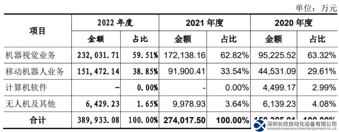 二輪問詢中,公司機(jī)器視覺業(yè)務(wù)毛利率的波動及移動機(jī)器人業(yè)務(wù)毛利率的持續(xù)下滑也被進(jìn)一步問詢。招股書顯示,公司上述兩大業(yè)務(wù)在報(bào)告期貢獻(xiàn)的營收占比均在95%以上,其中2022年貢獻(xiàn)度大約是六 四開。