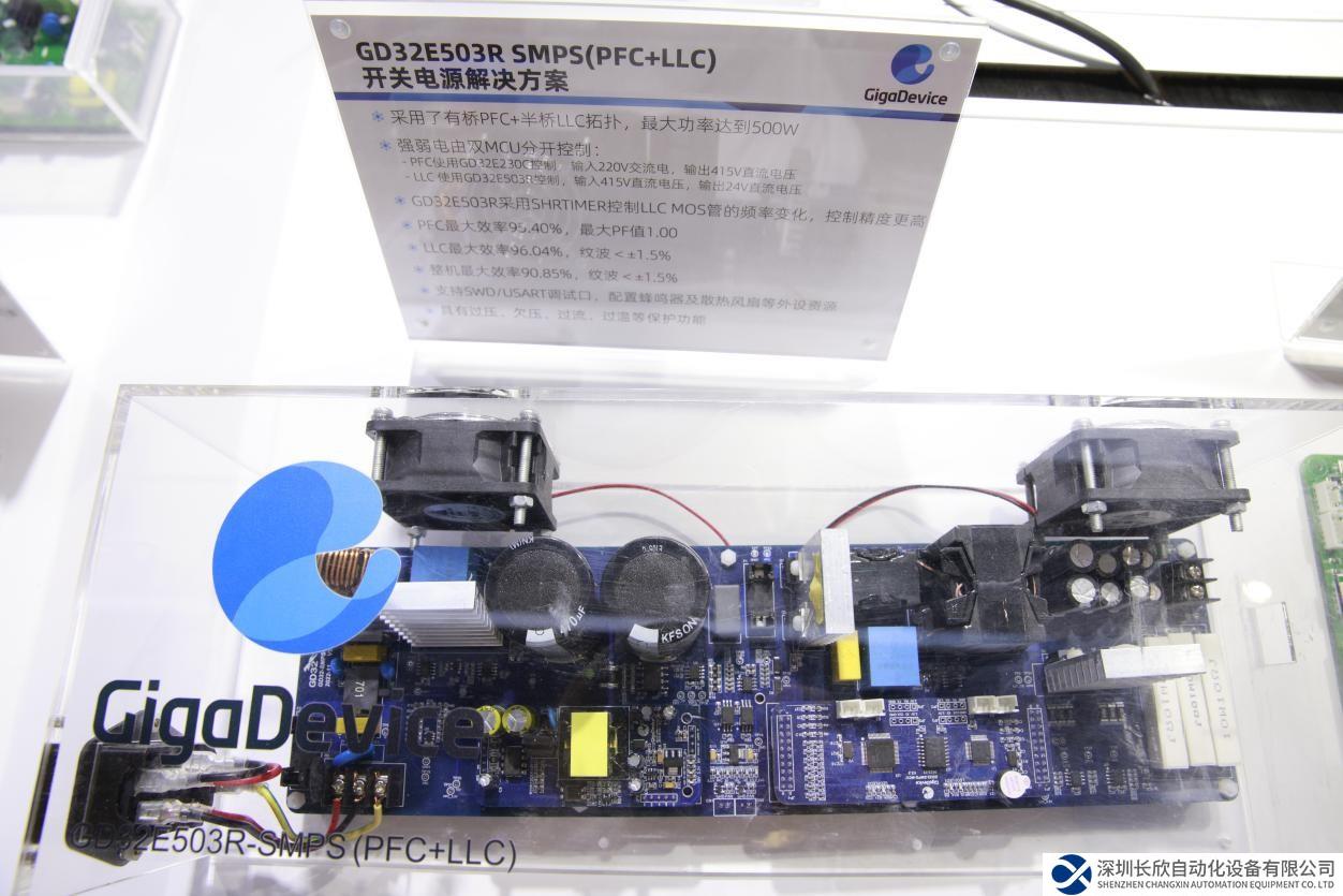 在用電側(cè),電源管理方案是提高系統(tǒng)整機電源轉(zhuǎn)換效率的一環(huán)。數(shù)字電源作為一種基于數(shù)字信號處理技術(shù)的電源,可以通過高效的數(shù)字控制方式,實現(xiàn)各種電壓、電流輸出的精確調(diào)節(jié)和穩(wěn)定性控制,具有更高的可編程性、自動化程度和抗干擾能力,因此成為電源方案的新趨勢。在兆易創(chuàng)新展臺,就有這么一款數(shù)字電源方案引發(fā)了行業(yè)觀眾們的圍觀與熱議——基于GD32E503R打造的SMPS(PFC+LLC)開關(guān)電源解決方案。